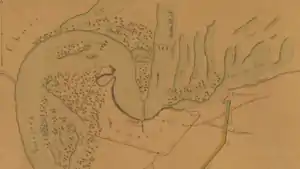 The fortress of Humaitá was situated on a level cliff about 30 feet (10 metres) above the river, on a sharp horseshoe bend.[58] The bend, called the ‘’’Vuelta de Humaitá’’’[59] was an ideal strategic pinch point. It was some 1,500 metres (4,900 ft) long; the navigable channel narrowed to only 200 metres (660 ft) broad; the current was 2.8 knots (5.2 km/h; 3.2 mph) and in places 3 knots (5.6 km/h; 3.5 mph), difficult for the ships of the day to stem; and (a matter that was to horrify the Brazilian navy[60]) ideal for the release of ‘torpedoes' (nineteenth century floating naval mines).[61][62]