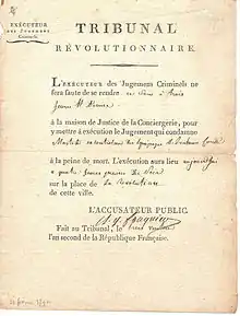 Despite this defense, he was sentenced to death, alongside the judges and some jurors of the Revolutionary Tribunal, among other charges, for abusing his authority and neglecting proper legal procedures during trials.[2] He was guillotined in Paris on 7 May, 1795, and became the last individual to be executed by the Revolutionary Tribunal before its abolition.[2]