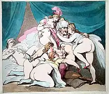 Painting by Alfred de Musset of three women and a man having a foursome.
