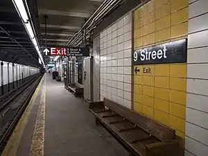 63. Cox, Jeremiah (October 21, 2005). "A 9 Street platform sign on a portion of the platform wall that's painted with Exit next to an arrow beneath it directing passengers to the station's exit. This text beneath the station's signs don't acknowledge the transfer to the IND and the F train at all". subwaynut.com. Retrieved December 18, 2018.