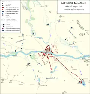 From the captured documents Klapka understood that he has a chance to defeat the besiegers in detail, and crush the siege.[7] So Klapka decided to crush the siege with a large scale sortie.[3] His job was eased also by the fact that the Danube split the Austrian siege corps into two which, because of this, could not help each other in the case of an attack, and the Vág river which flows in the Danube from the North, added a similar obstacle for the Austrian troops from the Northern shore.[3] Klapka wanted to chase away first the Austrian units from the northern (left) shore of the Danube. There stationed the weaker enemy units, and with the attack against them he hoped to create the false feeling in the Austrians that the Hungarian army wants to continue its operations on the Northern shore of the Danube.[3]