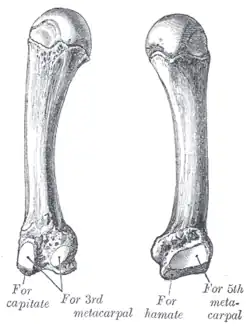 On the radial side are two oval facets, for articulation with the third metacarpal; and on the ulnar side a single concave facet, for the fifth metacarpal.