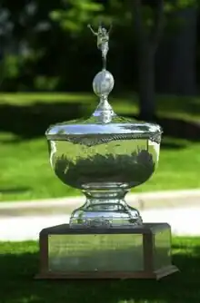 The James E. Foy, V-Omicron Delta Kappa Sportsmanship Trophy, more commonly known as the Foy-ODK Sportsmanship Trophy, is awarded annually to the winner of the Iron Bowl football rivalry game between the University of Alabama and Auburn University.[1] The trophy's namesakes are Dean James E. Foy, V, who served at both Auburn and Alabama and the father of photojournalist Mary Lou Foy, and Omicron Delta Kappa (ODK) National Leadership Honor Society, which has circles at both universities.[1] In years of Auburn victories, the trophy is displayed at the Auburn Arena in the Jonathan B. Lovelace Hall of Honor, and following Alabama victories, the trophy resides in the Paul W. Bryant Museum.[2]