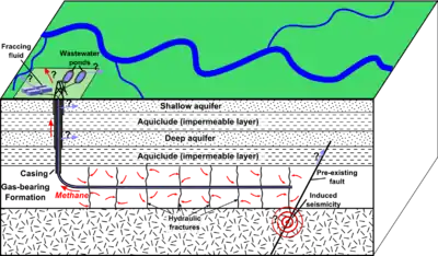 Potential environmental effects of hydraulic fracturing include contamination of ground water, risks to air quality, the potential migration of gases and hydraulic fracturing chemicals to the surface, the potential mishandling of waste, and the resulting effects on health such as an increased rate of cancer[89][90] and related environmental contamination.[91][92][93][94][95]