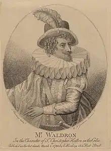 On 25 April 1772 Waldron was the original Sir Samuel Mortgage in George Downing's Humours of the Turf. On 17 May 1773 he took a benefit, as the original Metre, a parish clerk, in his own Maid of Kent (published 1778), a comedy based on a story in The Spectator (No. 123). On 12 May 1775, for his benefit and that of a Mrs. Greville, he produced his Contrast, or the Jew and Married Courtezan, played once only and not printed. Tribulation in The Alchemist followed, and on 22 or 23 March 1776 he was the original Sir Veritas Vision in William Heard's Valentine's Day. His Richmond Heiress, a comedy altered from Thomas D'Urfey, unprinted, was acted at Richmond in 1777, probably during his management of the theatre. On 19 February 1778 he was, at Drury Lane, the first Cacafatadri in Abraham Portal's Cady of Bagdad. He also played Shallow in the Merry Wives of Windsor. His Imitation, a comedy that remained unprinted, was brought out at Drury Lane for his benefit on 12 May 1783 and coldly received: it was a reversal of The Beaux' Stratagem with women substituted for men and men for women. Waldron played Justice Clack in the Ladies' Frolic (an adaptation of the Jovial Crew of Richard Brome).[1][3]