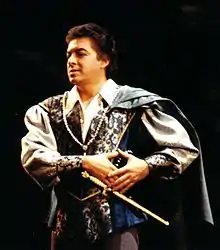 Araiza initially specialised in the Mozart and Rossini repertoire—in 1986 he was described as the leading tenore di grazia of the day.[11] However, in the mid-1980s he also began taking on Italian and French lyric tenor roles and the young Wagnerian heroes such as Lohengrin and Walther von Stolzing, sometimes with considerable success, especially his Des Grieux in Manon (San Francisco Opera, 1986) and Lohengrin (La Fenice, 1990).[4][12] He also ventured into the spinto tenor repertoire with performances at Zurich Opera in the 1990s as Alvaro in La forza del destino, Don José in Carmen and the title role in Andrea Chenier.