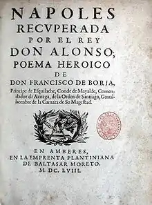 Napoles recuperada por el Rey Don Alonso poema heroico, title page, 1658 ed.