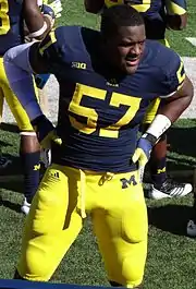 In Clark's first two years at Michigan he added over 60 pounds (27.22 kg), without losing any speed.[3] On September 21, he had 1.5 sacks against Connecticut,[15] including one on third down during Connecticut's final possession as the 2013 Wolverines clung to a 24–21 lead.[16] He also had two sacks against Penn State on October 12 and ran back a fumble recovery for a touchdown, although it was not enough to help Michigan avert its first loss of the season.[15][17] Following the regular season, he was recognized as a second-team All-Big Ten selection by the coaches and an honorable mention selection by the media.[18][19] On November 16, 2014, Clark was arrested for domestic violence and dismissed from the football team.[20]