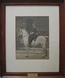 An official photograph of Richardson on a white horse in full dress uniform was taken outside the Hereford Police Station, Gaol Street, in 1919. This photograph was used in the local press and various publications which mentioned his career when he would retire at the end of the year.[51] He retired from his post on 30 December 1919.[52][53] His last official appearance in his position as Chief Constable of Hereford was appropriately enough in the court where he had presented many cases over the years on Friday 16 January 1920 when the mayor and city officials publicly thanked him for all his years of service. After a final bow to the court he, accompanied by his successor, Mr. Rawson, "addressed an unusually good muster of the city Police Force, who had formed up at the Parade Office at the Police Station."[54] A week earlier he had been presented with an illuminated address by the council and magistrates.[55] The city Fire Brigade held a separate presentation to their chief in the following week when he was reported to have made a long speech detailing the fires he had attended since 1883. He had also received a solid silver tea set from members of the Hereford City Police. During his time in office he had served three monarchs and over twenty mayors.
