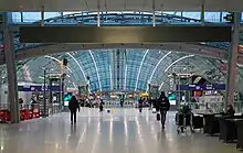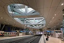 Frankfurt am Main Airport long-distance station (German: Frankfurt am Main Flughafen Fernbahnhof) is a railway station at Frankfurt Airport in Frankfurt, Germany. It is served by long-distance trains, mostly ICE services running on the Cologne–Frankfurt high-speed rail line. It is the largest railway station serving an airport in Germany with about 23,000 passengers each day. The station is served by 210 long-distance trains daily, of which 185 are Intercity-Expresses.[2] It and Limburg Süd station are the only railway stations in Germany that are served exclusively by long-distance trains.[3]
