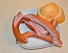 A Frankfurter Würstchen (Frankfurt sausage) is a thin parboiled sausage in a casing of sheep's intestine. The flavor is acquired by a method of low temperature smoking. For consumption, Frankfurters are occasionally not boiled; they are heated in hot water for only about eight minutes to prevent the skin from bursting. They are also commonly grilled over propane or charcoal flame. They are traditionally served with bread, mustard, horseradish and/or potato salad.