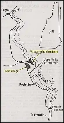 The Franklin Falls Dam is located on the Pemigewasset River in the city of Franklin, New Hampshire, in the United States. The dam was constructed between 1939 and 1943 by the Army Corps of Engineers[1] and extends for 0.75 miles (1.21 km) across the river. During its construction, the neighboring residents of the town of Hill were forced to relocate to higher ground due to rising water levels created by the dam. The reservoir formed by the dam has a permanent pool covering 440 acres (180 ha), and the total flood storage capacity is 2,800 acres (1,100 ha). The total area of the project, including surrounding managed lands, is 3,683 acres (1,490 ha).[1] The stretch of the Pemigewasset River potentially impounded by the dam extends 12.5 miles (20 km) north to Ayers Island Dam in the town of Bristol, and the watershed flowing to the dam extends north all the way into the White Mountains.