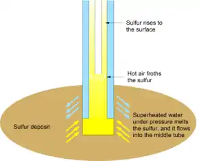 In the Frasch process, three concentric tubes are introduced into the sulfur deposit. Superheated water (165 °C, 2.5-3 MPa) is injected into the deposit via the outermost tube. Sulfur (m.p. 115 °C) melts and flows into the middle tube. Water pressure alone is unable to force the sulfur into the surface due to the molten sulfur's greater density, so hot air is introduced via the innermost tube to froth the sulfur, making it less dense, and pushing it to the surface.[1]