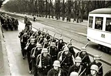 The League of Nations allowed for the Free City of Danzig to maintain a regular police force of several hundred men, which was bolstered by a poorly trained and ill-equipped citizens' militia with approximately 3,000 members.[1] The constabulary reported to the Danzig Senate's Department of Internal Affairs.[2] The police principally operated from 12 precincts, called Revier, and 7 registration points. Initially, they were organized as follows:[3]