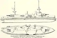 Suffren, named after Vice-amiral Pierre André de Suffren de Saint-Tropez,[12] was ordered on 21 April 1898 from the Arsenal de Brest.[2] She was laid down on 5 January 1899[13] and launched on 25 July of the same year. Her fitting-out was delayed by the late delivery of fittings and armour. Suffren began her sea trials in November 1903, but was not commissioned until 3 February 1904. On 18 August 1903 she participated in a gunnery trial with the predreadnought Masséna off Île Longue. A mild-steel plate 55 cm (21.7 in) thick, measuring 225 by 95 cm (7 ft 5 in by 3 ft 1 in), was attached to the side of Suffren's forward turret to determine the resistance of an armour plate to a large-calibre shell with six sheep placed in the turret to simulate its crew. Masséna anchored 100 m (330 ft) away from Suffren and fired a number of 305-millimetre shells at the plate. The first three were training shells that knocked splinters off the armour plate. The last two shells, fired with full charges, cracked the plate, but Suffren's turret was fully operational, as was her Germain electrical fire-control system, and the sheep were unharmed. One splinter struck Masséna above her armour belt and left a 15-centimetre sized hole in her hull. Another 50 kg (110 lb) splinter landed within a few metres of the Naval Minister, Camille Pelletan, who was observing the trials.[14]