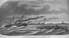 The submarine was armed with a ram to break holes in the hull of enemy ships, and an electrically fired spar torpedo, fixed at the end of a pole,[4] though later Admiral Bourgeois (who was, after 1871, chairman of the Commission on Submarine Defenses) opposed the use of torpedoes as the primary weapon in commerce warfare.[5]