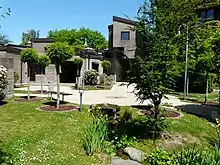 The highest point of the complex is the crystal-shaped community center: an emergent, 23 m tall bell tower, which is connected to the east to the church and to the northwest to various community rooms. Attached there is a church hall with a stage for up to 200 people and other meeting rooms. The rooms in the basement have access to the amphitheater. A flat-roofed two-storey staff building with seven apartments is attached to the southwestern side of the complex and a kindergarten eastward. The buildings are horseshoe-shaped, with a south-facing church square.[3]