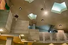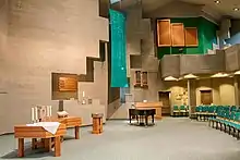 Single, small windows illuminate the room with a subdued light. Fourteen different electric light settings allow a very differentiated lighting of the church and the gallery. A screen (2 × 2 m) in the altar area allows a rear projection of images and texts for worship and events. To allow for a kind of dialogue sermon, the architect had planned two lecterns to be placed in concrete niches in the altar wall, which however have not been implemented. Foerderer intended the active involvement of church members in the organization of the service and thus wanted to invite for an intensive discussion of the Bible. Large lenten veils at the walls and a short-pile carpet provide excellent acoustics, so that the worship room is also often used for concerts. Throughout the center, elements such as orange doors or green window frames and benches add vivacious color accents.[1][2][3]