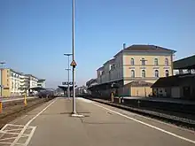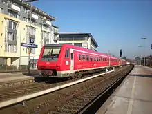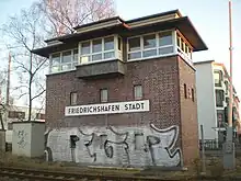 Friedrichshafen Stadt (city) station is the largest railway station of the city of Friedrichshafen on Lake Constance (Bodensee) and a railway junction in the German state of Baden-Württemberg. It has five tracks and is classified by Deutsche Bahn as a category 3 station.[1] Each day it is used by about 160 trains operated by Deutsche Bahn and the Bodensee-Oberschwaben-Bahn (BOB). Ulm–Friedrichshafen railway from Ulm ends at the station, where it meets the Stahringen–Friedrichshafen railway and the Friedrichshafen–Lindau railway. Another major railway station in the city, Friedrichshafen Hafen station (Friedrichshafen port station), which is operated as part of Friedrichshafen Stadt station, was used until 1976 for loading and unloading carriages on the Lake Constance train ferry to Romanshorn in Switzerland.