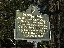 Friends' Bloomingdale Academy (previously, Western Manual Labor School) was an American Quaker coeducational school in Bloomingdale, Indiana that operated from 1846 to 1916.[1] For many years, this institution enjoyed the rank of an Indiana commissioned high school.[2]