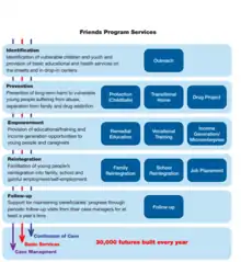 Friends-International runs a social services program supporting the development of children, youth, their families and communities that impacts over 30,000 beneficiaries a year in Cambodia, Thailand, Laos and Indonesia.[5] The Friends program is defined by a range of services that respond to the many challenges that marginalized young people face, namely abuse, sickness, drug use, exclusion from educational and training opportunities, child labor, poverty and separation from family. The program consists of a continuum of care in which beneficiaries build gradually to the end result of reintegration. Program services are facilitated through a comprehensive case management system (individualized support to each beneficiary by an assigned case manager) and ongoing access to basic services (health checkups, non-formal education, awareness building, counseling).