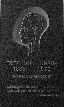 Fritz von Unruh (German: [ˈʊnʀuː]; 10 May 1885 – 28 November 1970) was a German expressionist dramatist, poet, and novelist.
