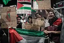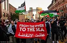 The slogan has been used widely in pro-Palestinian protest movements.[65] It has often been chanted at pro-Palestinian demonstrations, usually followed or preceded by the phrase "Palestine will be free" (the phrase rhymes in English, not Arabic).[66][67][68][69] Interpretations differ amongst supporters of the slogan. In a survey conducted by the Arab World for Research and development on November 14, 74.7% Palestinians agreed that they support a single Palestinian state "from the river to the sea." whilst only 5.4% of respondents supported a "one-state for two peoples" solution.[70][71][72]
