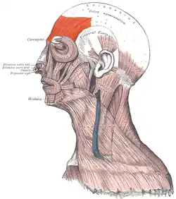 The frontalis muscle (from Latin 'frontal muscle') is a muscle which covers parts of the forehead of the skull. Some sources consider the frontalis muscle to be a distinct muscle. However, Terminologia Anatomica currently classifies it as part of the occipitofrontalis muscle along with the occipitalis muscle.[2]