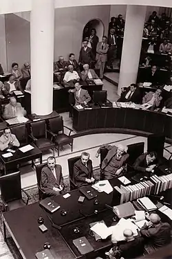 From right-left: Ze'ev Sherf, David Ben-Gurion, Moshe Sharett, and Haim-Moshe Shapira sitting at the government table in the Chamber at Froumine House.