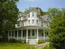 While Queen Anne houses of its era would often have Eastlake detailing, this house is unusual for having ornament which is almost all Colonial Revival in style. These elements include a Palladian window, the simple Tuscan columns on the house's wraparound gallery, and denticular molding under the eaves of the main block and on the turret and dormer.[2]