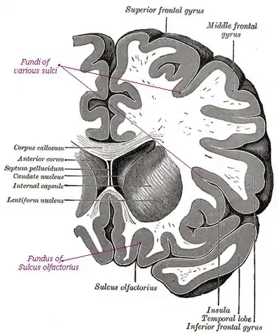 Fundi, sulci, and gyri in a section across a human brain