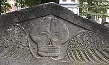 The death's head is the earliest and most frequently occurring motif in colonial era American headstones. The head usually is winged, and accompanied by imagery such as hourglasses, bones and coffins.[33] Though seemingly frightening to modern viewers, the image of a skull was then less about inspiring dread in the viewer, and more about acknowledging a normal, everyday fact of human life. In their belief system, death was when the flesh passed away to make way for renewal in the afterlife.[34] The skulls reflect puritan funeral rituals in total, including their approach to elegies, funerals rites and sermons.[35] Commonly, the horses carrying the remains of the deceased to the graveyard were draped with robes containing painted coffins and death's heads.[36] Burial usually took place three to eight days after death, with the headstone erected up to eight months later.[37]