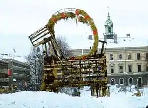 The Gävle Goat (Swedish: Gävlebocken, Swedish pronunciation: [ˈjɛ̌ːvlɛbɔkːɛn]) is a traditional Christmas display erected annually at Slottstorget (Castle Square) in central Gävle, Sweden. The display is a giant version of a traditional Swedish Yule goat figure made of straw. It is erected each year by local community groups at the beginning of Advent over a period of two days.[1][2]