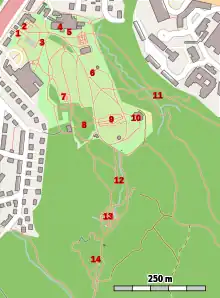 1. Entrance area, 2. The shop, 3. Gramina et Flores, 4. Greenhouses, 5. Bulbs, 6. Kitchen Garden, 7. Herb Garden, 8. Bamboo Thicket, 9. Perennials, 10. Restaurant and café, 11. Woodlands, 12. Rhododendrons, 13. Rock garden, 14. Japanese Glade.