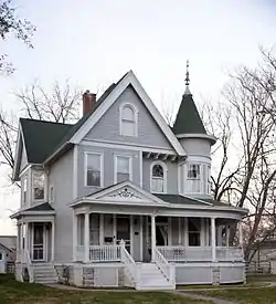 It was constructed according to mail order plans provided by George F. Barber & Co. of Knoxville, Tennessee. The final design is a combination of two designs offered in Barber's 1899 catalog and modifications by the Allens and their builder. It was one of several Barber-designed houses in Mount Pleasant.[2] The 2½-story Queen Anne has an irregular plan, frame construction, a full basement, hip roof with lower cross gables, and circular tower with a conical roof. Because the house is from the later stage of the Queen Anne style it features decorative elements from the Neoclassical and the Neocolonial styles instead of Eastlake detailing.[2] The house was built by George S.W. Alien, a Vermont native, who operated his own clothing store.