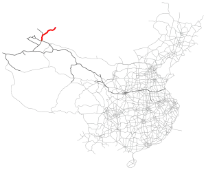 The G3014 Kuytun–Altay Expressway (Chinese: 奎屯—阿勒泰高速公路, Uyghur: كۇيتۇن-ئالتاي يۇقىرى سۈرئەتلىك تاشيولى), commonly referred to as the Kui'a Expressway (Chinese: 奎阿高速公路), is an expressway that connects the cities of Kuytun and Altay in Xinjiang, China. The expressway is 527 kilometres (327 mi) in length,[1] with a 135-kilometre long (84 mi) section between Kuytun and Karamay that is concurrent with the G3015 Kuytun–Tacheng Expressway.[2] The entire expressway is part of Asian Highway 67.
