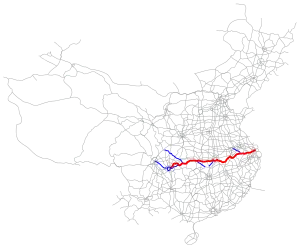The Shanghai–Chongqing Expressway (Chinese: 上海—重庆高速公路), designated as G50 and commonly referred to as the Huyu Expressway (Chinese: 沪渝高速公路) is an east-west bound expressway that connects the cities of Shanghai, China in Yangtze River Delta, and Chongqing in western China. The expressway runs through six provinces/municipalities and adjoin major cities such as Wuhu, Anqing, Wuhan and Yichang, roughly parallel to G42 Shanghai-Chengdu Expressway to its south. The thoroughfare begins at Huqingping Outer Ring Interchange near Hongqiao International Airport, where it meets S20 Outer Ring Expressway in Shanghai, and terminates at an interchange in Jiangbei District, where the highway joins G75 Lanzhou-Haikou Expressway. It is fully complete and spans 1,900 km (1,200 mi) in length.