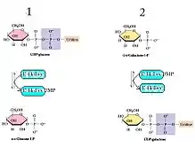- Galactose-1-phosphate + E-His-UMP ⇌ UDP-galactose + E-His[8]