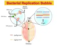 In some bacterial genomes, there is an enrichment of guanine over cytosine and thymine over adenine on the leading strand and vice versa for the lagging strand. The nucleotide composition skew spectra ranges from −1, which corresponds to G = 0 or A = 0, to +1, which corresponds to T= 0 or C = 0.[2] Therefore, positive GC skew represents richness of G over C and the negative GC skew represents richness of C over G. As a result, one expects to see a positive GC skew and negative AT skew in the leading strand, and a negative GC skew and a positive AT skew in the lagging strand.[5] GC or AT skew changes sign at the boundaries of the two replichores, which correspond to DNA replication origin or terminus.[2][4][5] Originally, this asymmetric nucleotide composition was explained as a different mechanism used in DNA replication between the leading strand and lagging strand. DNA replication is semi-conservative and an asymmetric process itself.[6] This asymmetry is due to the formation of the replication fork and its division into nascent leading and lagging strands. The leading strand is synthesized continuously and in juxtapose to the leading strand; the lagging strand is replicated through short fragments of polynucleotide (Okazaki fragments) in a 5' to 3' direction.[6]