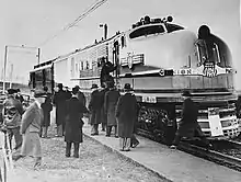 The locomotives were in operation for six months, among the shortest operational careers in recorded railroading.[7] After being completed in December 1938, they were first tested by GE at its Erie, Pennsylvania facility, then road tested on New York Central tracks between January and March 1939.[2] They were then delivered to UP in April 1939 at Omaha, Nebraska, in time for the 70th anniversary of the completion of the first transcontinental railroad in May, and given road numbers 1 and 2.[2][5][8] According to UP historians William Kratville and Harold Ranks, the new locomotives were hoped to be the "replacement to steam" and the "successor of diesels".[2] After completing test runs, UP put the locomotives on public display with tour trains, a national tour, and an inspection by President Franklin D. Roosevelt.[5][8] They were present at the grand opening of the Los Angeles Union Passenger Terminal and were on display in Omaha for the world premier of Cecil B. DeMille's film Union Pacific on April 28.[2]