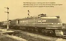 During test runs, the locomotives displayed excellent acceleration and an ability to maintain schedules better than conventional steam engines, although they also had serious reliability problems and relatively high maintenance costs.[2][8] On one occasion, the two locomotives failed while hauling a train from Colorado to Omaha, necessitating a 2800-class Pacific steam locomotive to pull them along with the rest of the train for the remainder of the journey.[2] The locomotives worked on several routes in a variety of different capacities, including both passenger and perishable freight service, although they never entered regular revenue service; in June 1939, the railroad returned them to GE in Chicago for what UP president W. M. Jeffers called "necessary modification and/or reconstruction".[2][5][8]