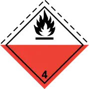Flammable solids, self-reactive substances and solid desensitized explosives – Solids which, under conditions encountered in transport, are readily combustible or may cause or contribute to fire through friction; self-reactive substances which are liable to undergo a strongly exothermic reaction; solid desensitized explosives which may explode if not diluted sufficiently | ||