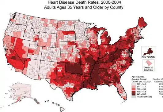 Today’s public health problems are much larger in scope than those Dr. Snow faced, and researchers today depend on modern GIS and other computer mapping applications to assist in their analyses. For example, see the map to the right depicting death rates from heart disease among white males above age 35 in the US between 2000 and 2004.[4]