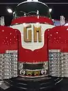 At 33 feet long, 8 feet wide, more than 11 feet tall, and weighing more than 12 tons, each Futurliner featured heavily stylized art deco, streamlined bodywork, deep red side and white roof paint, large articulated chrome side panels, a military-grade 302 cubic inch GMC straight-six gasoline engine and automatic transmission,[4] whitewall tires and a prominent, high-mounted, centrally located driver command position with a panoramic windshield. A rarely seen technical feature was that the front wheels, in addition to rear wheels, were also dual wheels.[2]