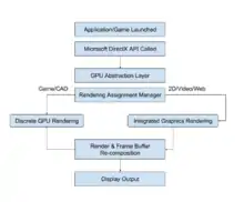 The Northbridge is one of the core logic chipset that handles communications between the CPU, GPU, RAM and the Southbridge. The discrete graphics card is usually installed onto the graphics card slot such as PCI-Express and the integrated graphics is integrated onto the CPU itself or occasionally onto the Northbridge. The Northbridge is the most responsible for switching between GPUs. The way how it works usually has the following process (refer to the Figure 1. on the right):[1][2]