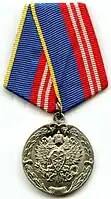 Awarded to military personnel of the Directorate of Special Programs of the President of the Russian Federation for 15 years of good service. Inscription on reverse "ПРИ ПРЕЗИДЕНТЕ РОССИИ" (UNDER THE PRESIDENT OF RUSSIA). The 2016 order changed the ribbon from the previous military colours (left) to its present departmental specific colours (right).[13][19] |