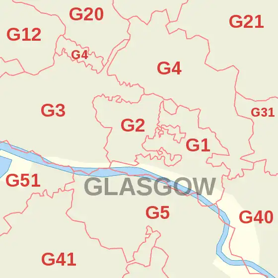 The G postcode area, also known as the Glasgow postcode area,[2] is a group of postcode districts in central Scotland, within five post towns. These districts are primarily centered on Glasgow itself, and West Dunbartonshire (including Dumbarton, Clydebank and Alexandria), plus parts of the council areas of Argyll and Bute (including Arrochar and Helensburgh), East Dunbartonshire, North Lanarkshire, South Lanarkshire, East Renfrewshire and Stirling.