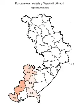 The Gagauz are an ethnic Turkic minority in Ukraine. The total number of the Gagauz diaspora was 31,923 counted in the 2001 census, most of whom (86.51%) live in the Bessarabian region of Odesa Oblast: Izmail, Reni, Kiliya, and Bolhrad raions (districts).[1][2]