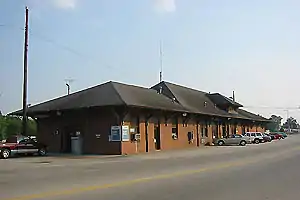 Constructed for the Southern Railway in 1910, the red brick station was built to replace an earlier depot damaged by a tornado in 1903.[2] Norfolk Southern, successor of Southern Railway, uses most of the building as office space. The passenger waiting area is open for an hour before and an hour after trains arrive.[2] The station is currently also used by a local chapter of the Fraternal Order of Eagles.[3]