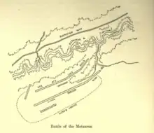 Polybius gives a detailed description of the events of the battle, particularly the death of Hasdrubal and the strategy used by Claudius to seize the overall victory.[43] Hasdrubal was followed by Roman legions led by Claudius as he was attempting to meet up with his brother Hannibal in Italy.[42] Hasdrubal sent out messengers outlining the meeting point; these dispatches were intercepted by the Romans, providing them with the means to adopt an offensive approach now that they knew the plans. Claudius had been camped close to Hannibal, in a strategic position. He was stationed further south than his colleague and co-consul M. Livius Salinator, and he set off to march north to join Livius and eventually reach Hasdrubal near the Metaurus River.[44] He left most of his army to keep watch, and joined up with Livius at night. After Hasdrubal realized there were two Roman consuls in the same camp, he decided to retire until he could make contact with his brother. Claudius was commanding from the right wing of the Romans; however he was obstructed by a ravine and couldn't get around. Ingeniously Claudius marched his troops behind the Roman lines to emerge in a surprise attack behind Hasdrubal's forces.[43] Livy described this battle as a disaster for the Carthaginians, with around 56,000 troops dead.[45]